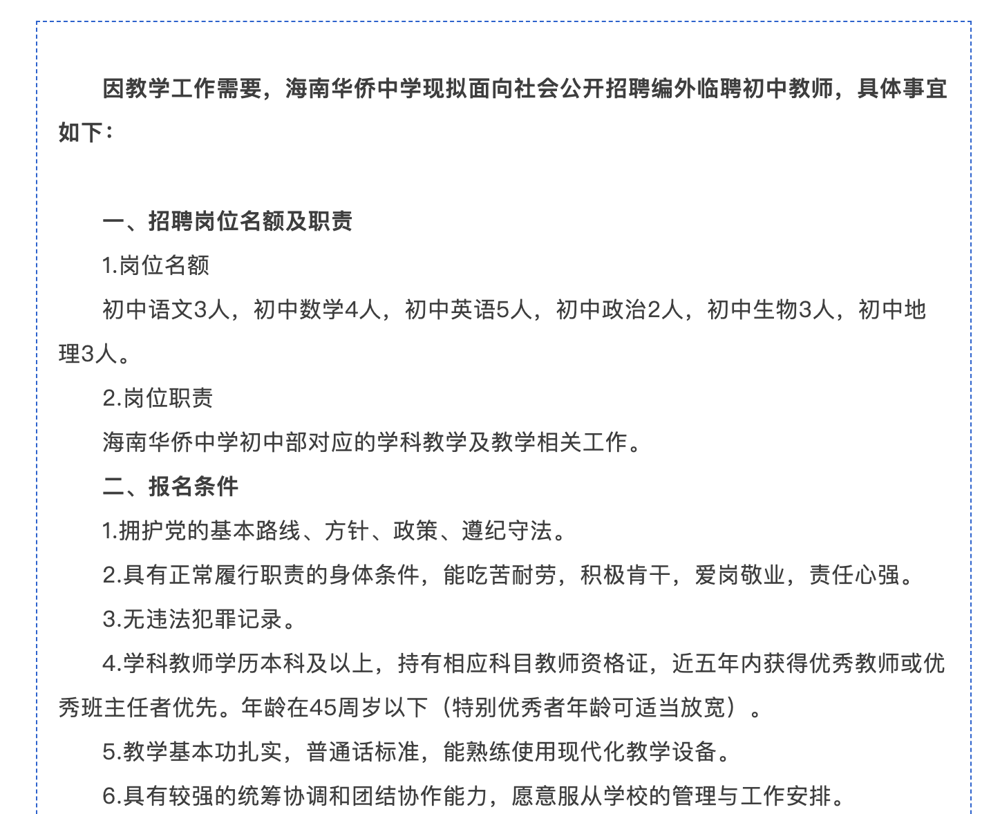 海南华侨中学现拟面向社会公开招聘编外临聘初中教师